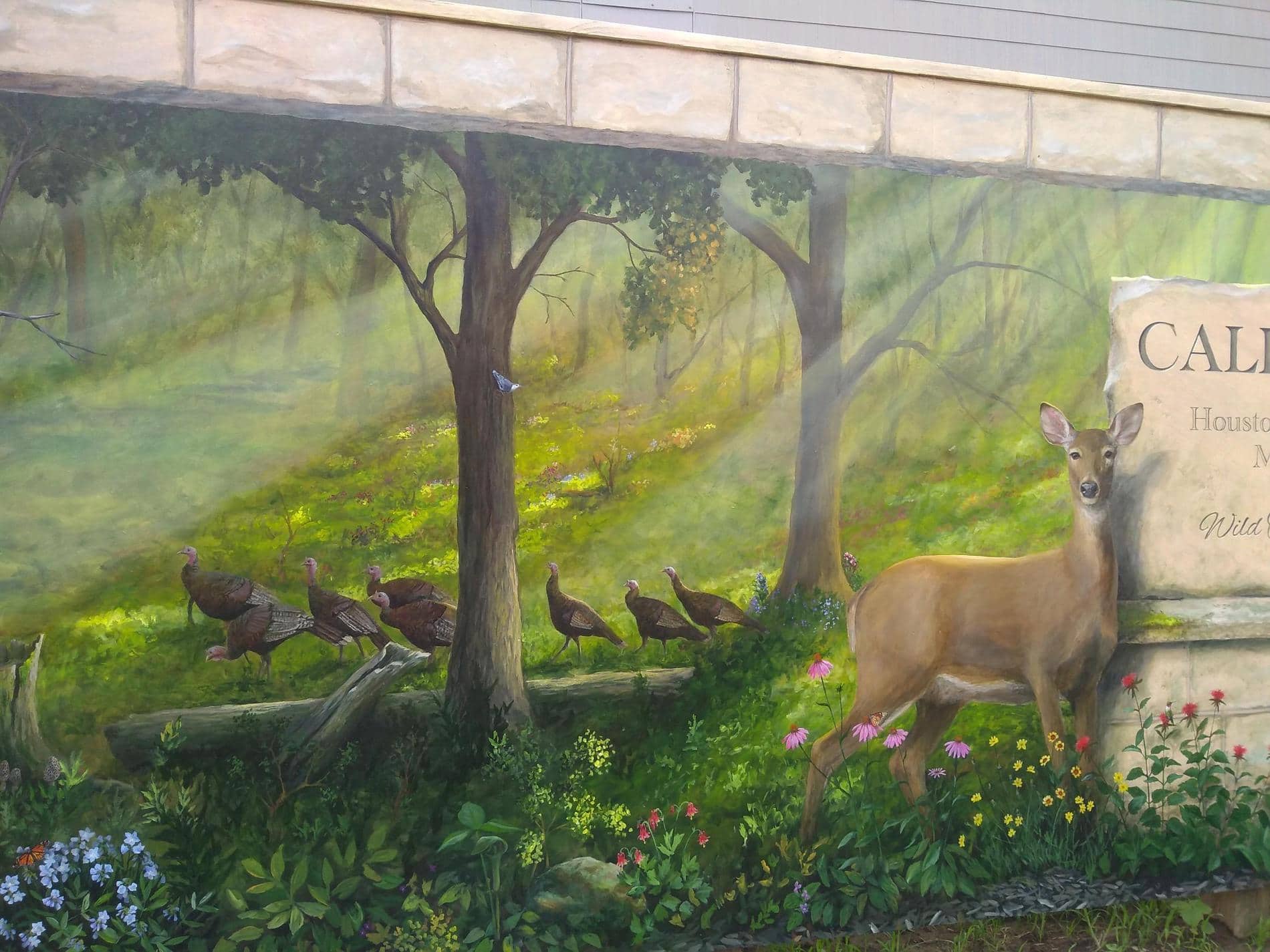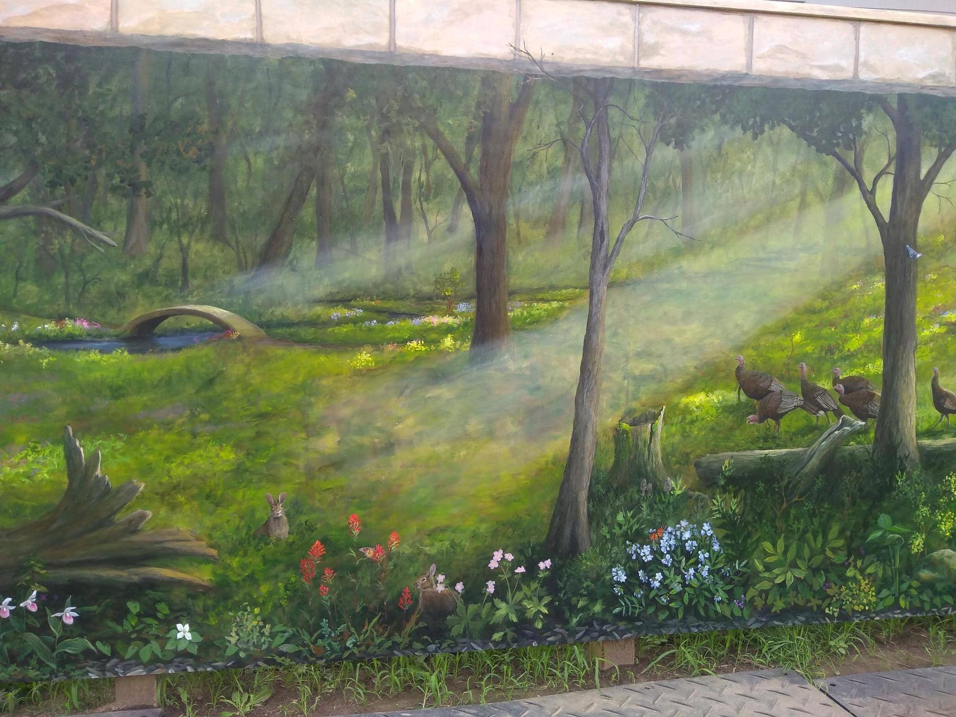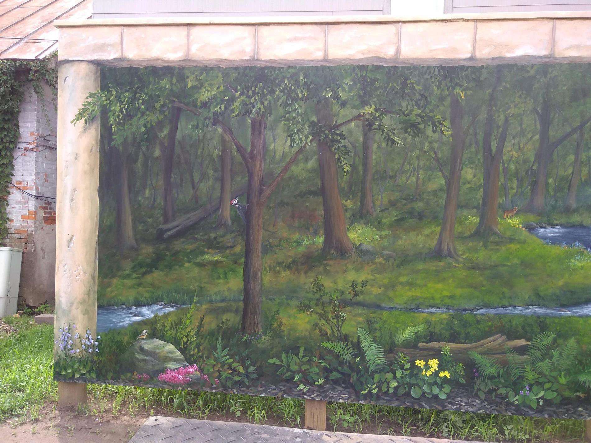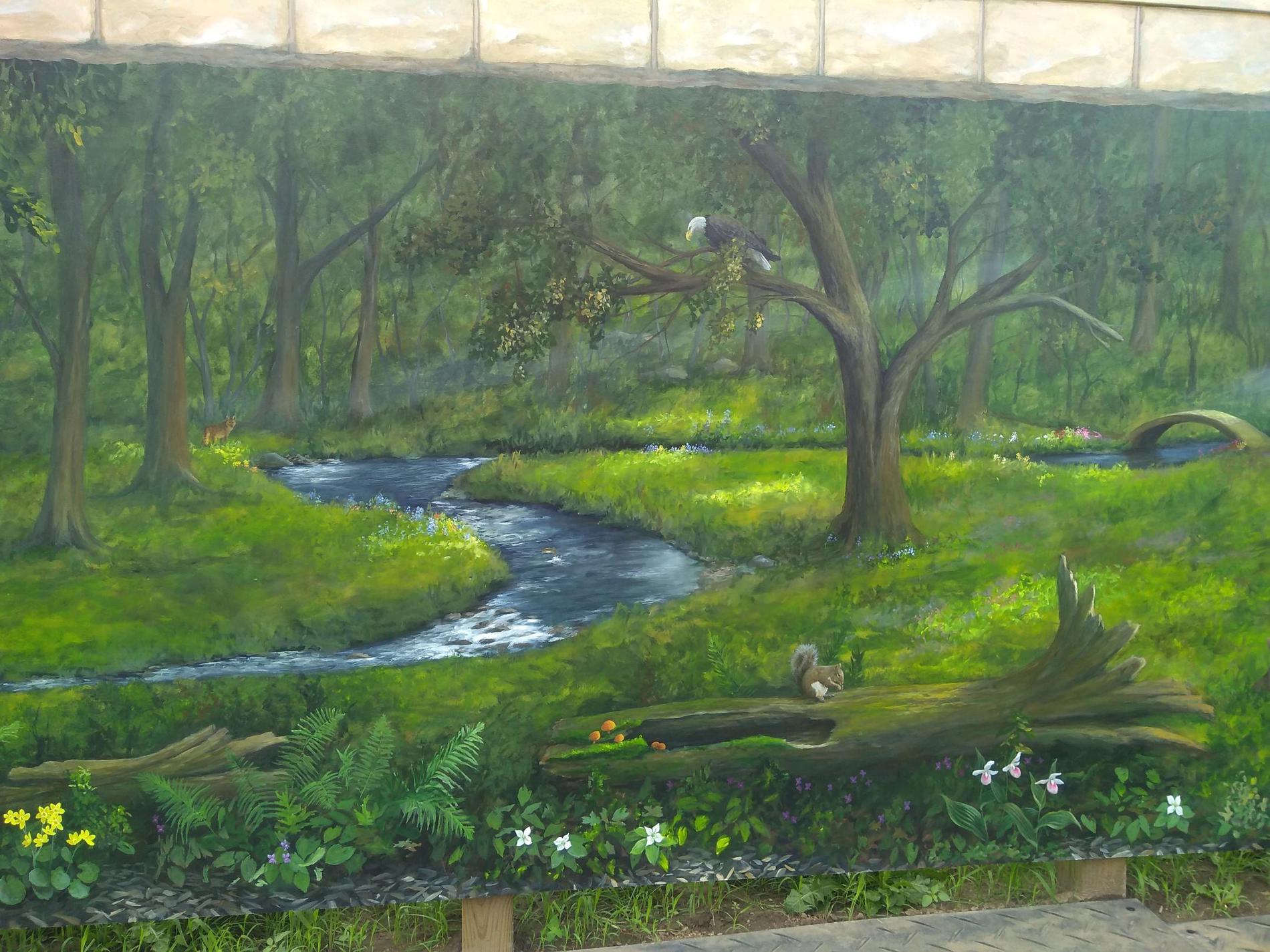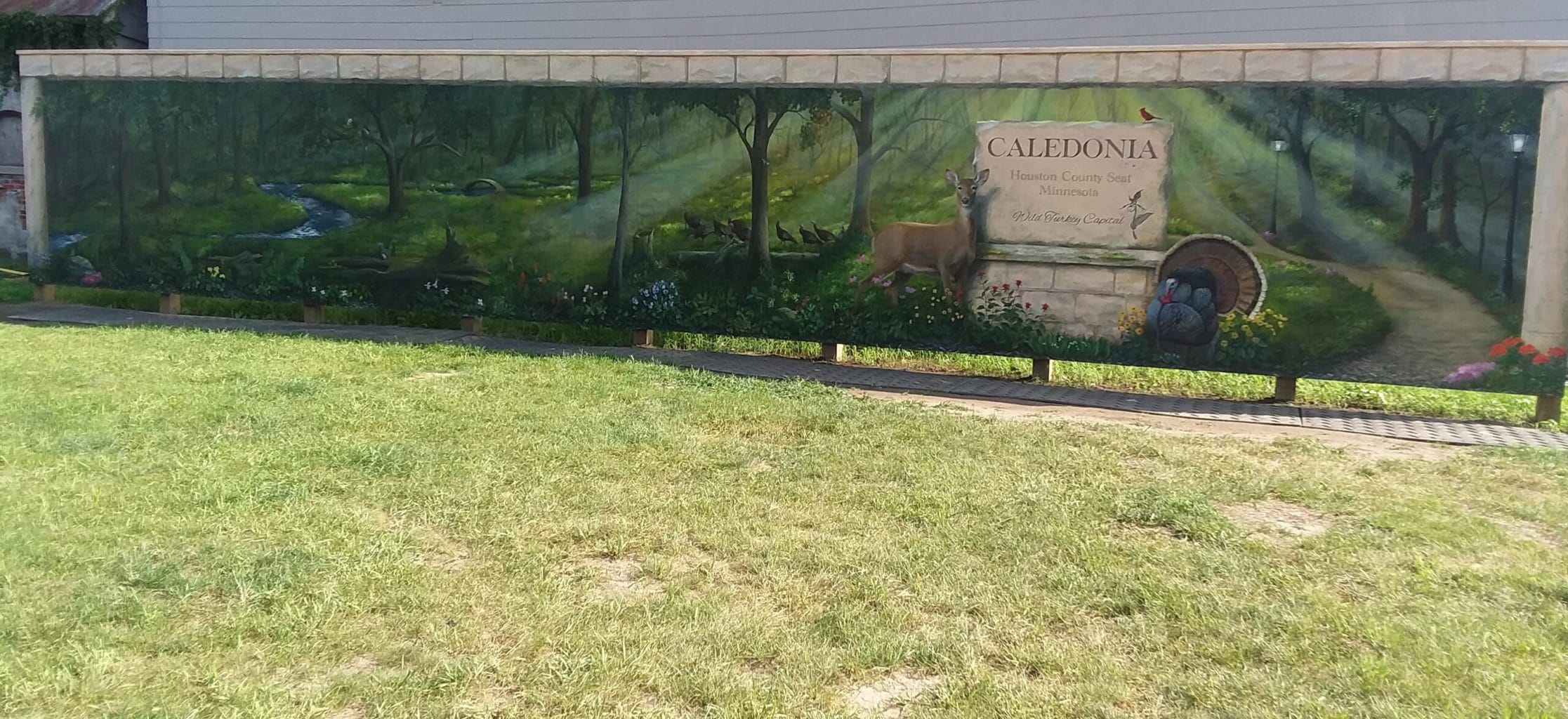 Sarah Pederson of Lucid Painting recently completed an 8′ x 48′ mural in downtown Caledonia at the site of the future pocket park. The mural was paid for by a $7,500 grant from the Arlin Falck Foundation. The project was spearheaded by the City of Caledonia’s StreetScapes/Caledonia Green Committee.
